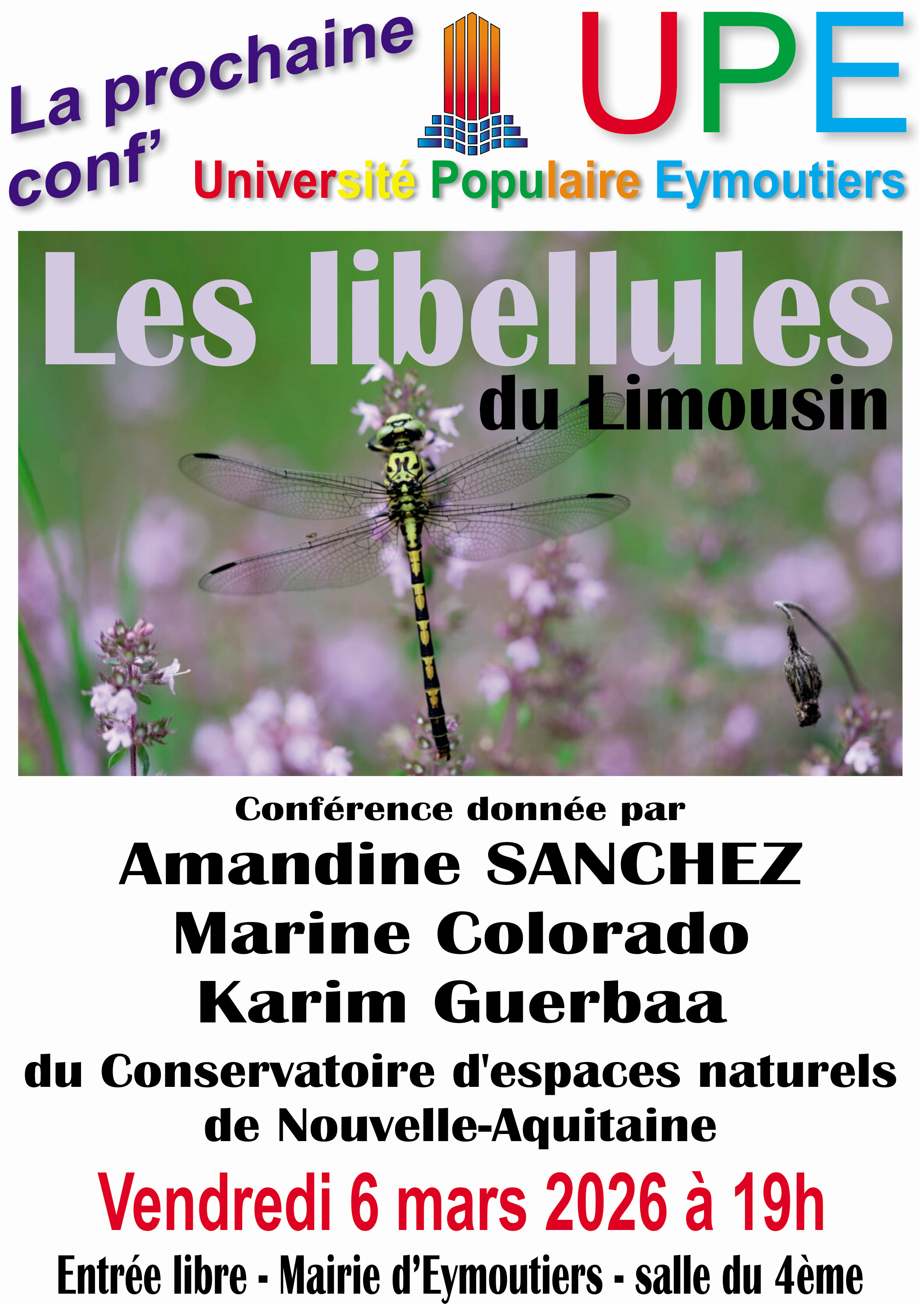 Le Conservatoire d’espaces naturels (CEN) de Nouvelle-Aquitaine et la Société Limousine d’Odonatologie (SLO) vous proposent une conférence pour découvrir les libellules du Limousin et leurs habitats naturels. Un Plan National d’Action en faveur des libellules est animé par le Conservatoire, nous vous présenterons les différentes actions menées par le CEN et la SLO pour protéger ces espèces et les zones humides qu’elles affectionnent. Les actions du CEN sont financées par l’Agence de l’Eau Loire-Bretagne et Adour-Garonne et la Région Nouvelle-Aquitaine.